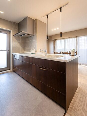 キッチンカウンターの下に造作で収納を付けさせていただきました。キッチン本体の色と並べても、違和感のない様面材を何度もお打合せしました。