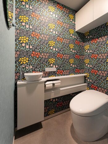 トイレの壁紙はアクセントをきかせて。。。ミラー越しに見る壁紙が何とも素敵ですね♪