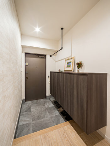 元々は、圧迫感のある狭い玄関廊下でしたが、間取り変更により、ゆとりのある広い玄関に仕上がりました。
