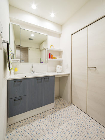 ブルー系の配色で清潔感があり、女子力が上がりそうな、かわいい洗面室に仕上がりました。