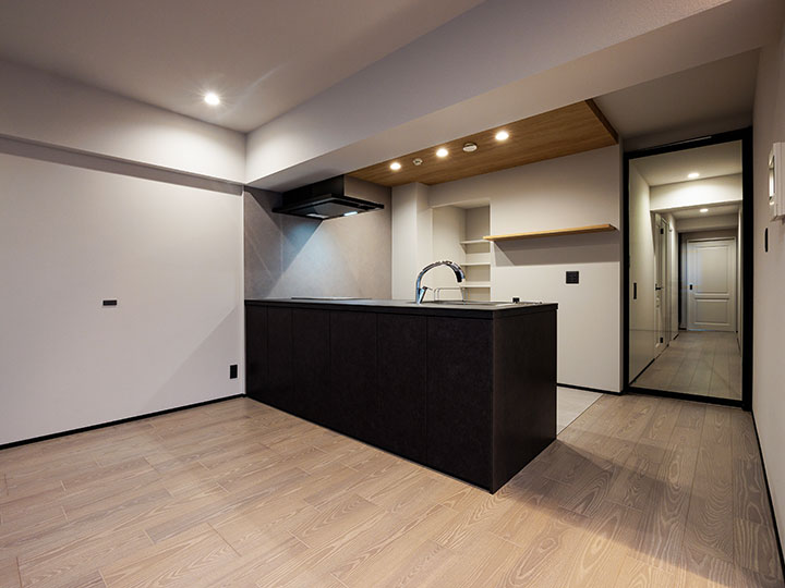無機質になりすぎないように、飾り棚と天井面に木目を入れさせていただきました。
