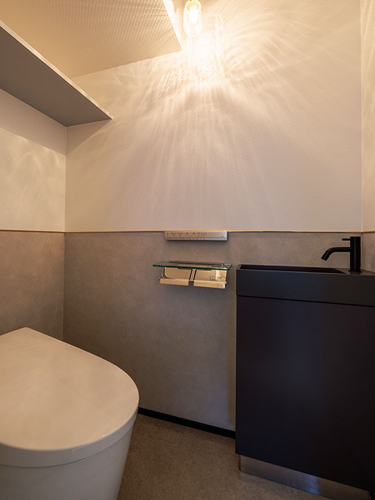 壁のクロスを上下で切り替り事で、ワンランク上の高級感のあるトイレ空間となりました。