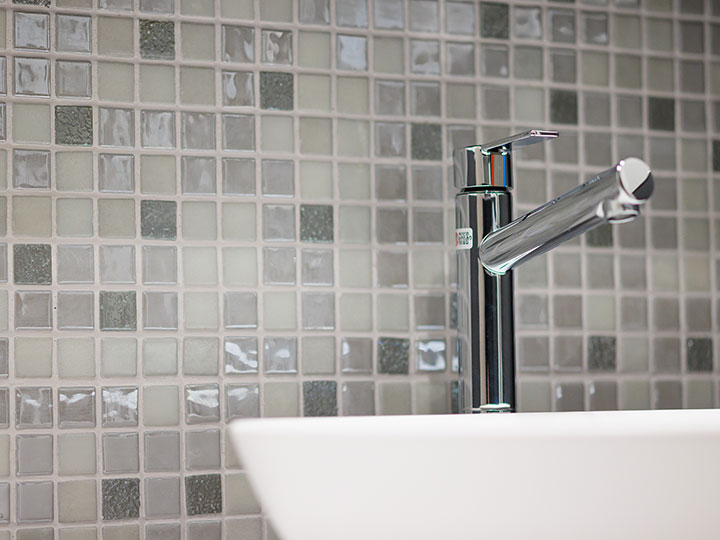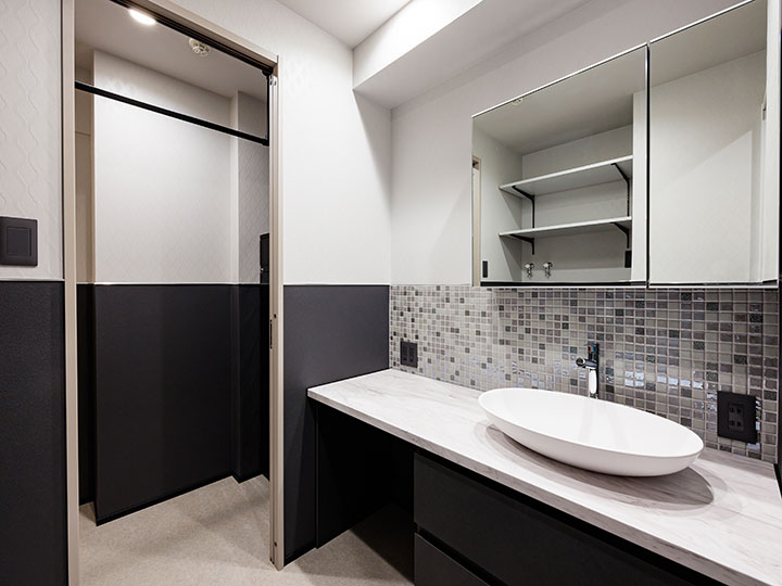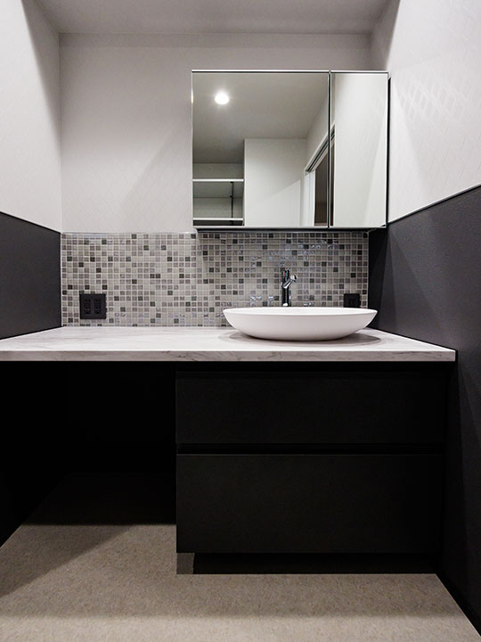 鏡の間にはタイルを施工、壁のクロスもトイレ同様に上下で切り替えをして高級感のある空間がとなりました。