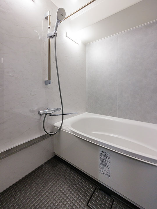 洗面室の空間に合わせて、 石目のアクセントと薄いグレーの壁色をお選びいただきました。 鏡や収納棚等は付けず、シンプルでお掃除のしやすい浴室となりました。