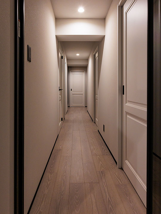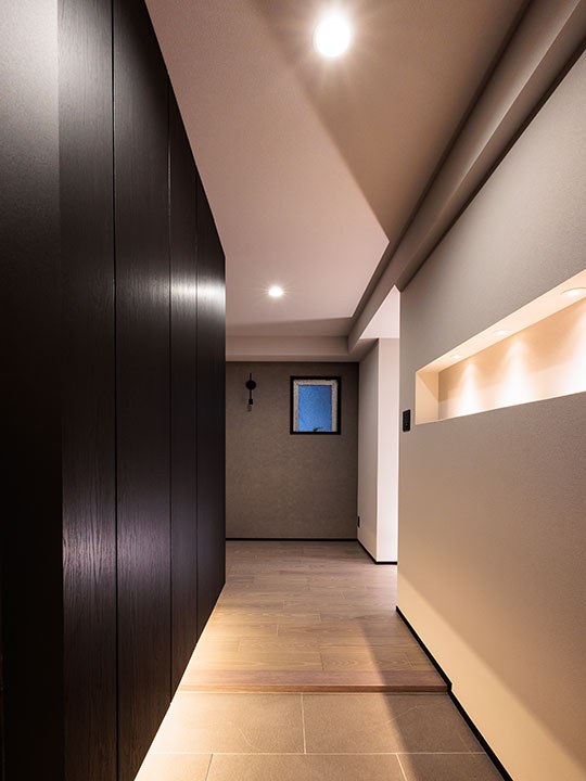 玄関収大容量の玄関収納を設置し、向かいにはディスプレイ用のニッチを造作、 間接照明も入れ、玄関を開けた瞬間に別空間が広がります。