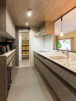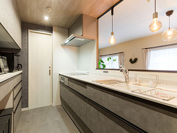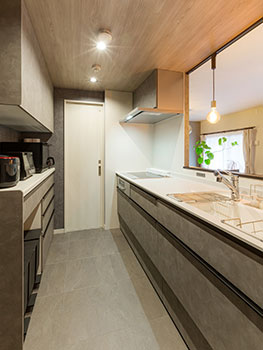 ・クロスのコーディネート ・キッチンから洗面へ入れるように入り口をつくりました。 ・キッチンの天井は木目柄のクロスに ・出来るだけ引戸を使用 |