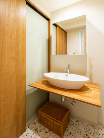 洗面所はシンプルだけどセンス良く・・・床フロアシートの柄が引き立ちます。