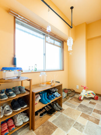 一番のご要望の玄関土間はお子様の乗り物やスコップ、虫かご等・・・さりげなく置く感じがおしゃれです。土間タイルも悩んで選んだお気に入りです。窓からの光も充分入る明るい土間スペースが完成。