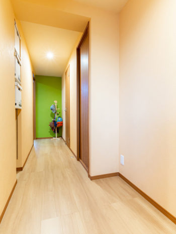 玄関から室内を見た時にグリーンの壁紙が可愛い♪廊下の見せる収納スペースも使い勝手満点!