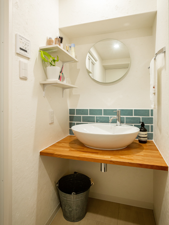 洗面所は両サイド壁にピッタリのサイズで洗面カウンターを造作。 タイルや洗面ボウルも、可愛くおしゃれな感じ。。。奥様お気に入りの場所になりました。 |