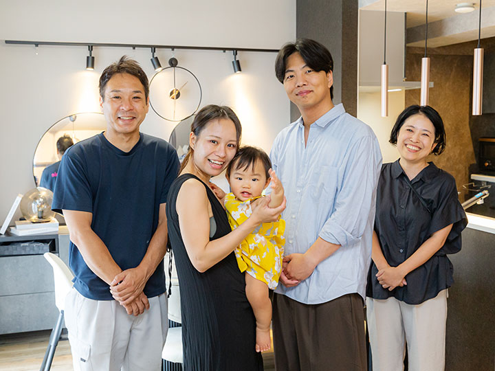 (左から工事担当:藤原 中央:U様ファミリー 営業担当:出口)