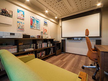 ご主人様のお部屋は防音室。壁、天井、ドア等防音工事を行いました。大音量で趣味の音楽や映画館鑑賞ができます。お隣りのリビングでくつろぐ奥様への音もシャットアウトできお互い快適に過ごせそうです!