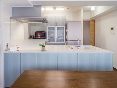 将来的に安心、安全に暮らすために可能な床部分は全てバリアフリーにして動きやすい空間にしました。 また、キッチンももともとあったリビングとの間の壁を撤去してペニンシュラ型にすることで開放的かつ広いキッチンへのご提案をさせていただきました。 |