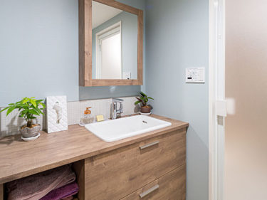 洗面所にもブルーグレーのクロスを使いキッチンとの統一感を持たせています。 また洗面台も幅を大きくし収納力も増えました。