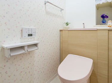 ピンクのトイレに合わせて花柄のクロスが可愛く仕上がりました。