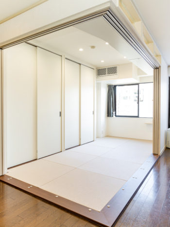 畳スペースと大容量の収納スペース。お布団やお洋服もたっぷり収納出来ますね。天井照明はダウンライトに取替えることで更にスッキリ!
